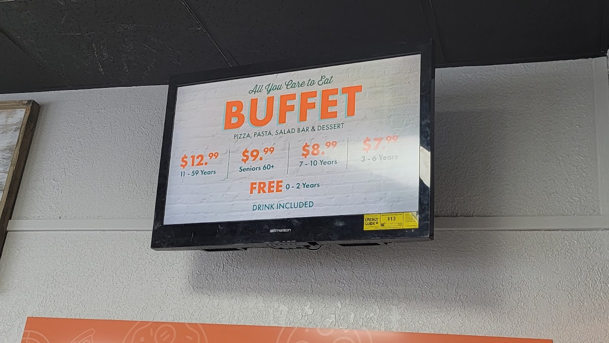 “ I couldn't be more impressed. Extraordinarily clean, pizza was hot and plentiful. They even have seasoned potato wedges and green beans (amongst other items) over and above the pizza, pasta and salad bars. The soda fountain is crushed nugget ice. Amazing. Super clean, well staffed and high quality foods. Bravo to the owner, management and staff. Will be back asap. They even have goldfish on the well appointed salad bar and don't sleep on the mac n cheese, or the pudding.. or the s'mores dessert pie. ”